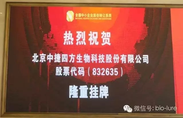 2015年6月1日,北京中捷四方生物科技股份有限公司(證券簡稱:中捷四方,股票代碼:832635)獲批在全國中小企業(yè)股份轉(zhuǎn)讓系統(tǒng)(“新三板”)掛牌。2015年7月10日,北京中捷四方生物科技股份有限公司“新三板”掛牌儀式在全國股份轉(zhuǎn)讓系統(tǒng)公司舉行,“新三板”的成功掛牌,標(biāo)志著北京中捷四方正式踏入資本市場。