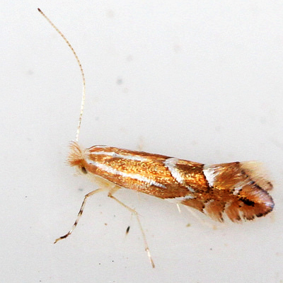 金紋細(xì)蛾(Lithocolletis ringoniella Mats.) 成蟲(chóng)體長(zhǎng)3毫米左右,前翅金黃色,具有3條白色細(xì)紋,翅端前緣有3個(gè)銀白色爪狀紋,后緣有1個(gè)三角形白色斑。后翅狹長(zhǎng),灰褐色,緣毛甚長(zhǎng)!1年發(fā)生3-6代。以蛹在蟲(chóng)斑內(nèi)隨落葉越冬。于翌年春季成蟲(chóng)羽化,產(chǎn)卵于嫩葉上。幼蟲(chóng)孵化后即潛入葉表皮內(nèi)潛食葉肉。幼蟲(chóng)老熟后在蟲(chóng)斑內(nèi)化蛹。在河南,成蟲(chóng)各代發(fā)生期大約是越冬代4月上、中旬,第1代5月底到6月上旬,第2代7月上、中旬,第3代8月份,第4代9月份,大約在11月上、中旬第5代幼蟲(chóng)成熟,在蟲(chóng)斑內(nèi)化蛹越冬。金紋細(xì)蛾春季發(fā)生較少,夏、秋季發(fā)生較多,為害嚴(yán)重。發(fā)生期不整齊,后期各代重疊。 |